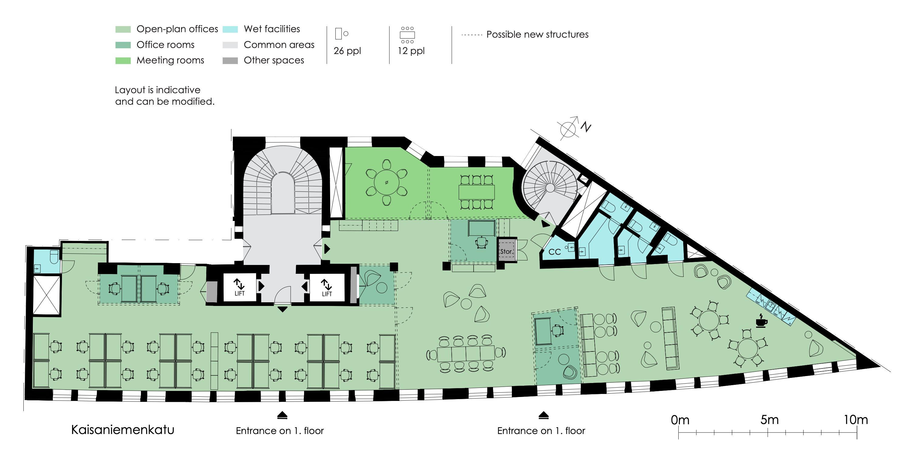 | Office space | 2 | 220 m2 | Free | A neat office space with views of both Kaisaniemenkatu and the courtyard. A pipe and sewer renovation was carried out in the property during 2025, and at the same time, all the toilet surfaces and sanitary fixtures were renewed. |